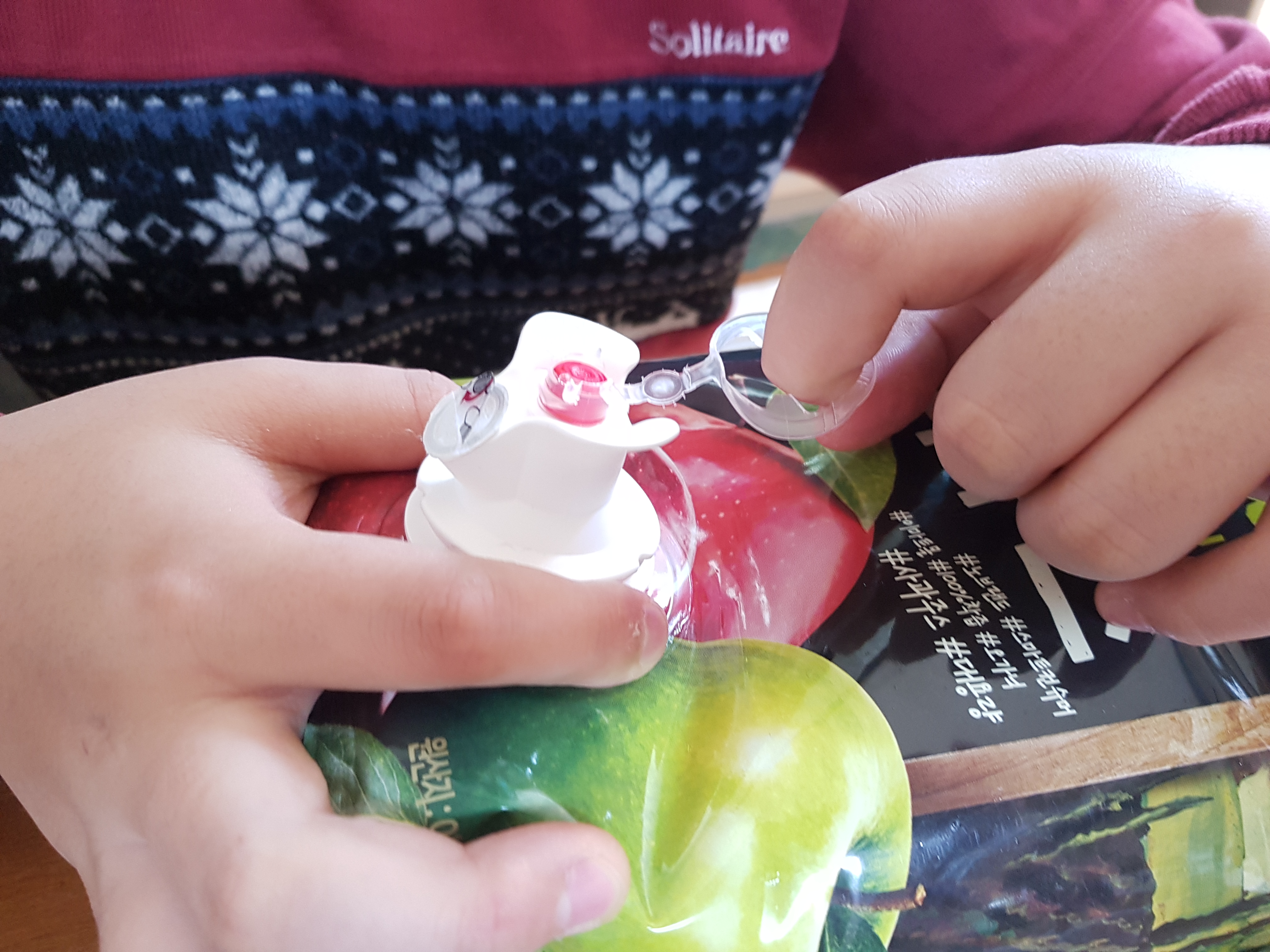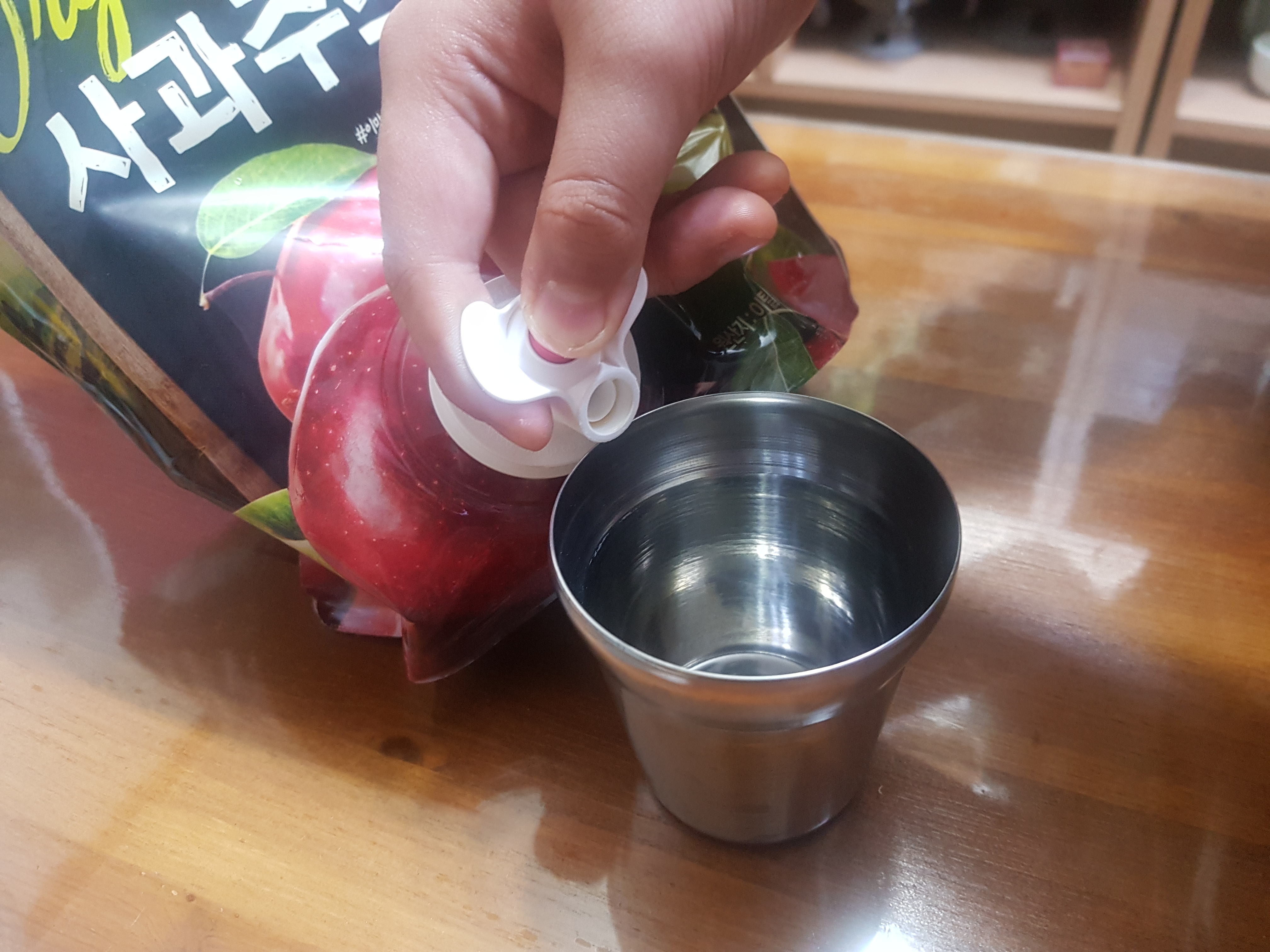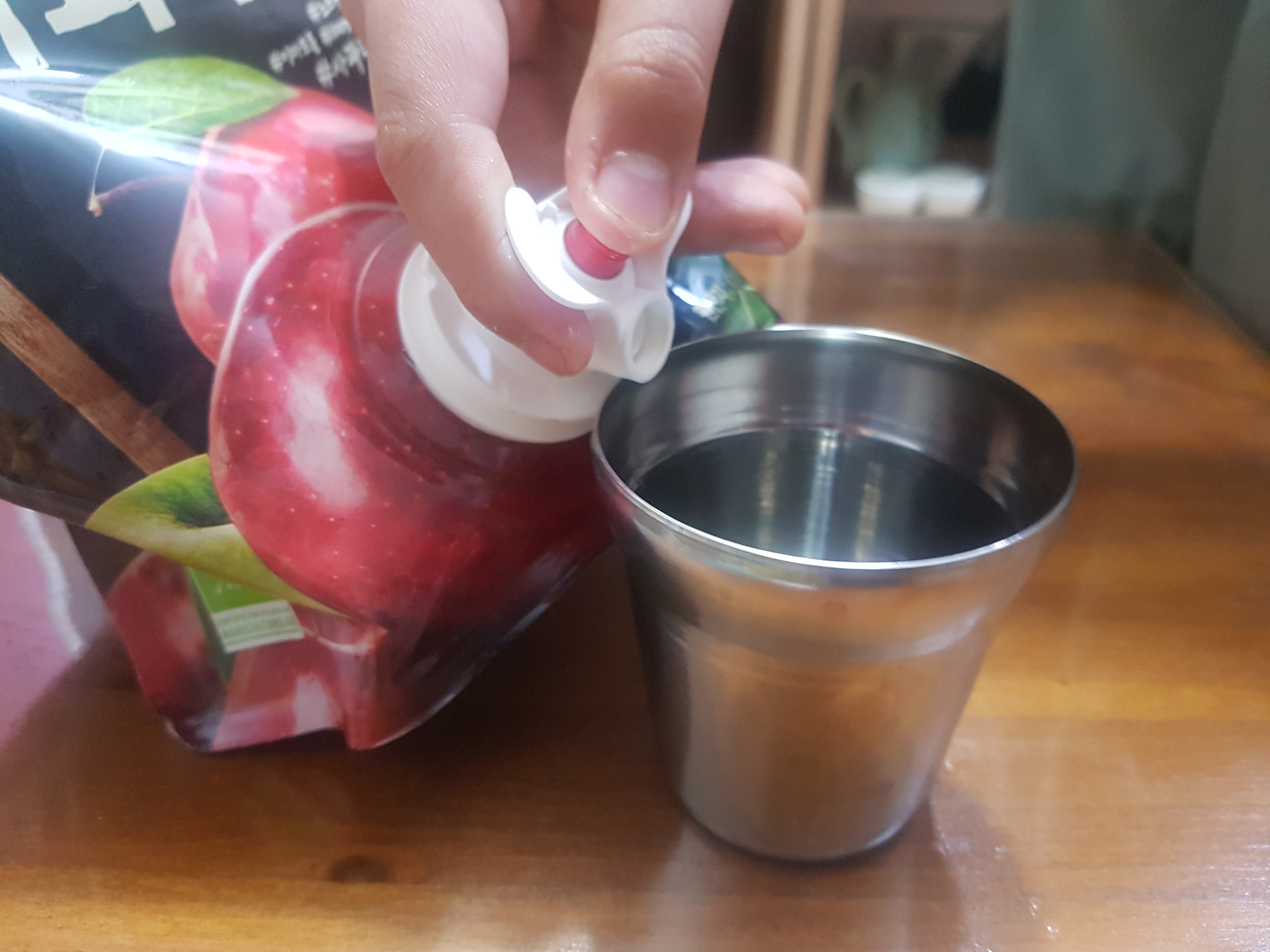 나중에는 익숙해져서 그냥 식탁 위에 쥬스팩을 세워두고 뒤로 살짝 기울이면서