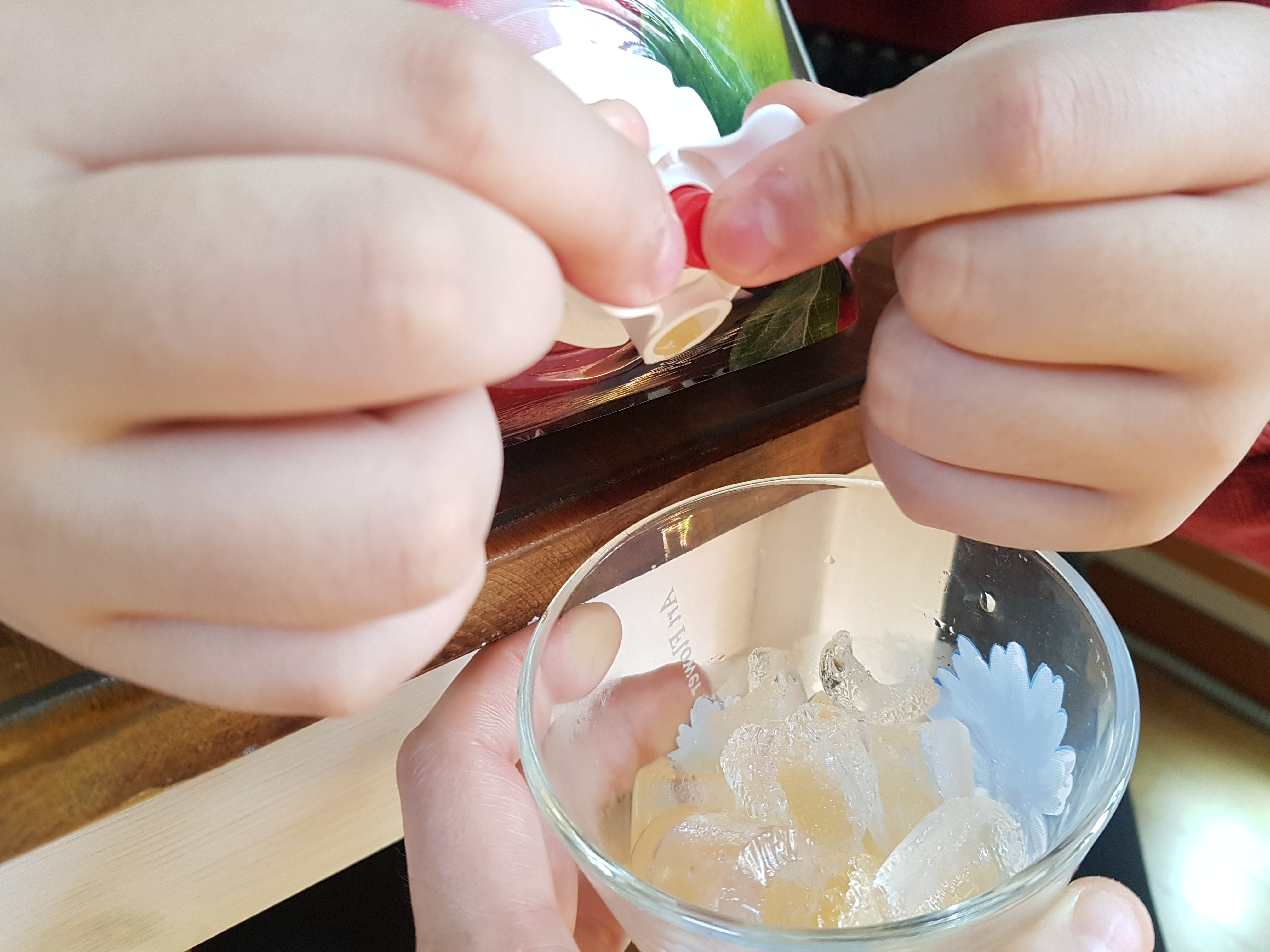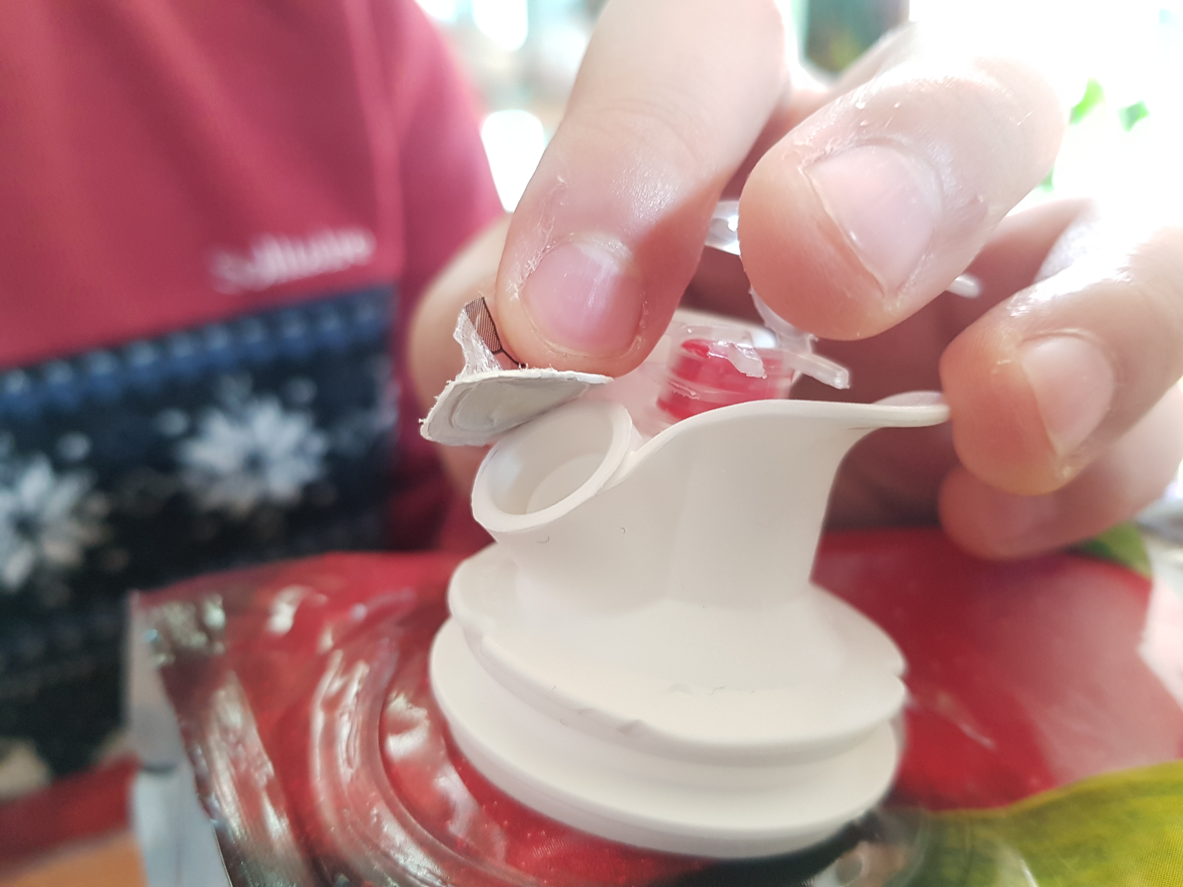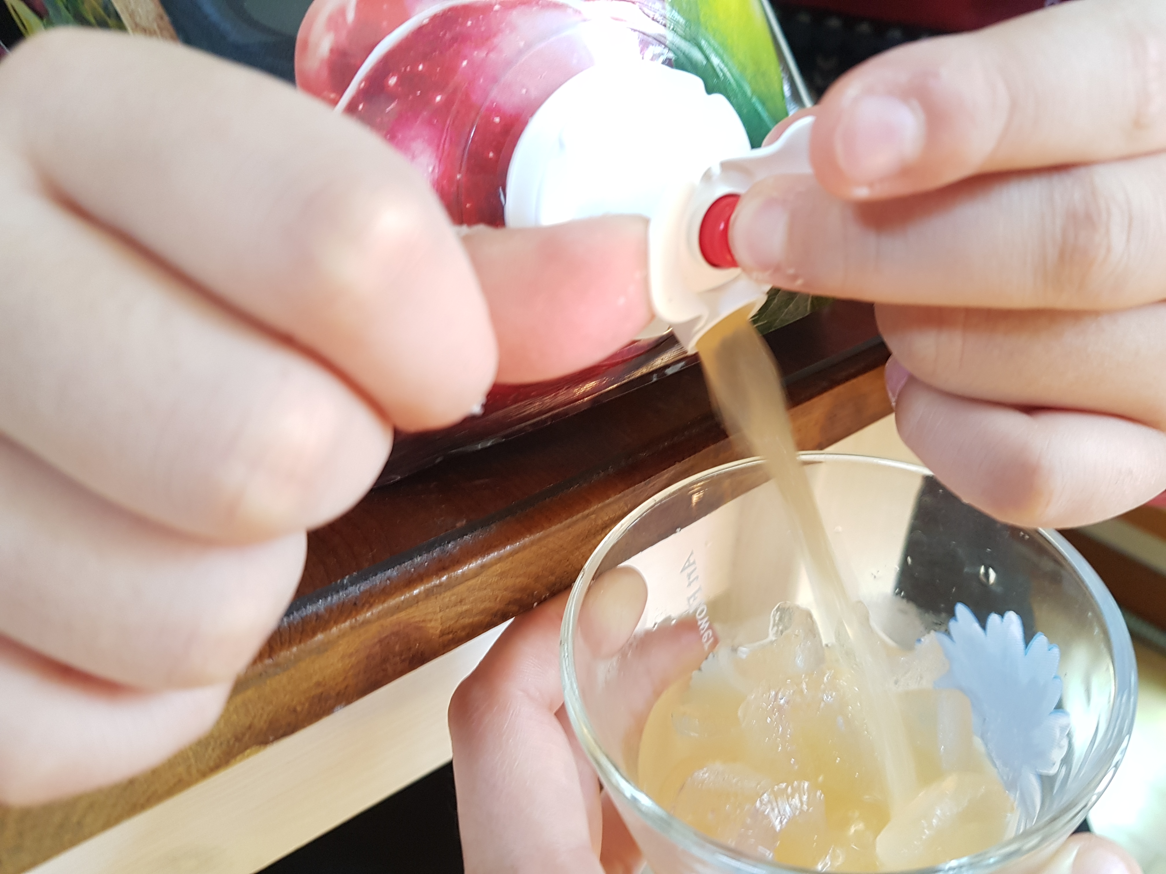 처음에는 익숙하지 않아서 식탁 끝에 주스팩을 놓고 두 손을 사용해서 빨간 버튼을 눌렀는데