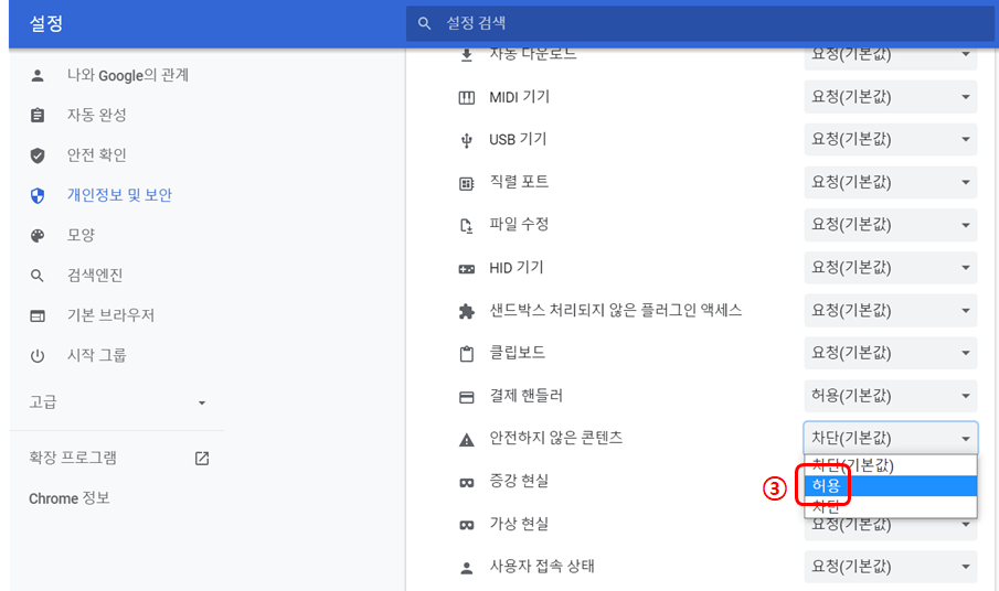③ 스크롤을 쭉 내려 '안전하지 않은 콘텐츠' 메뉴를 찾아,