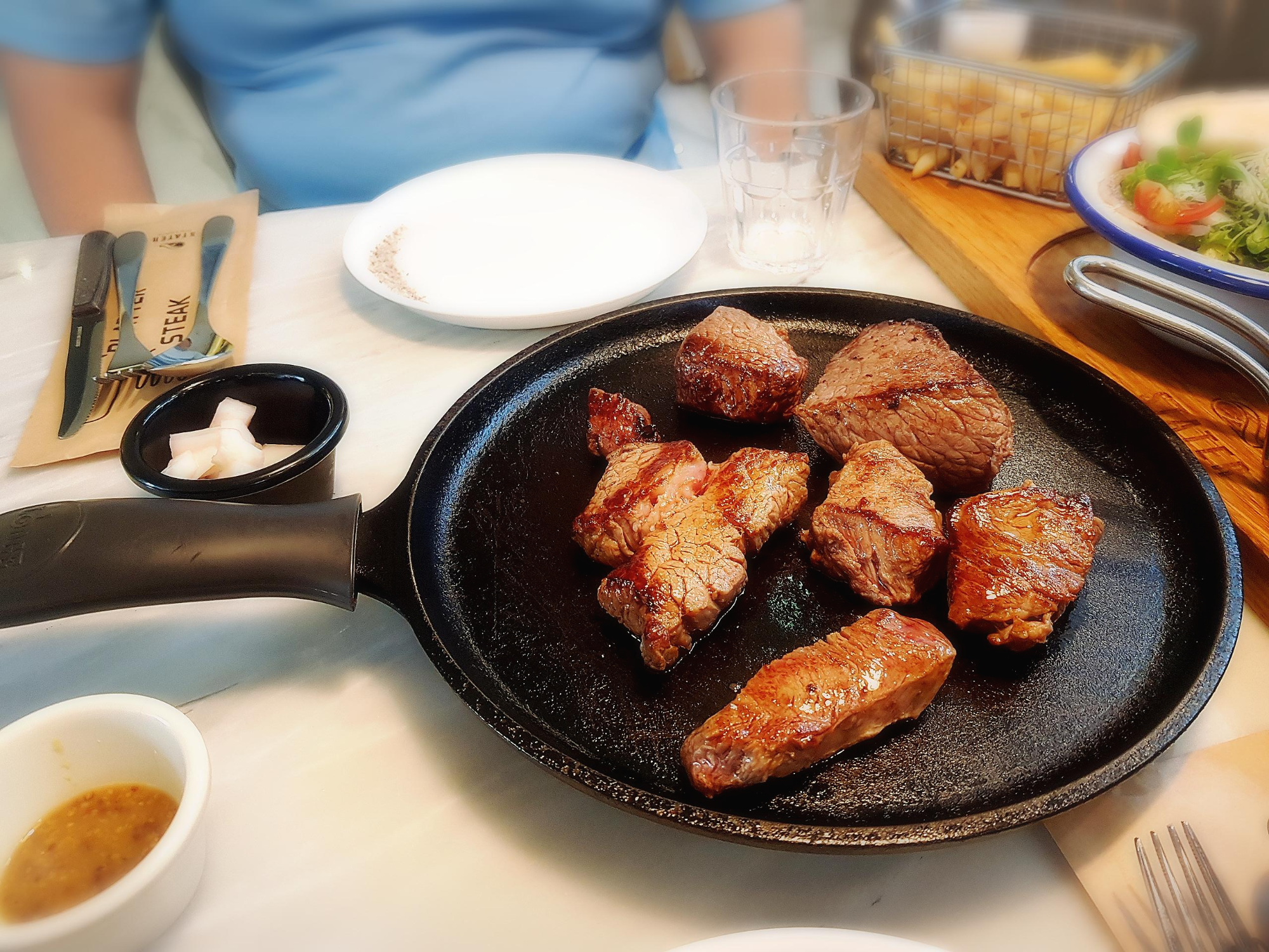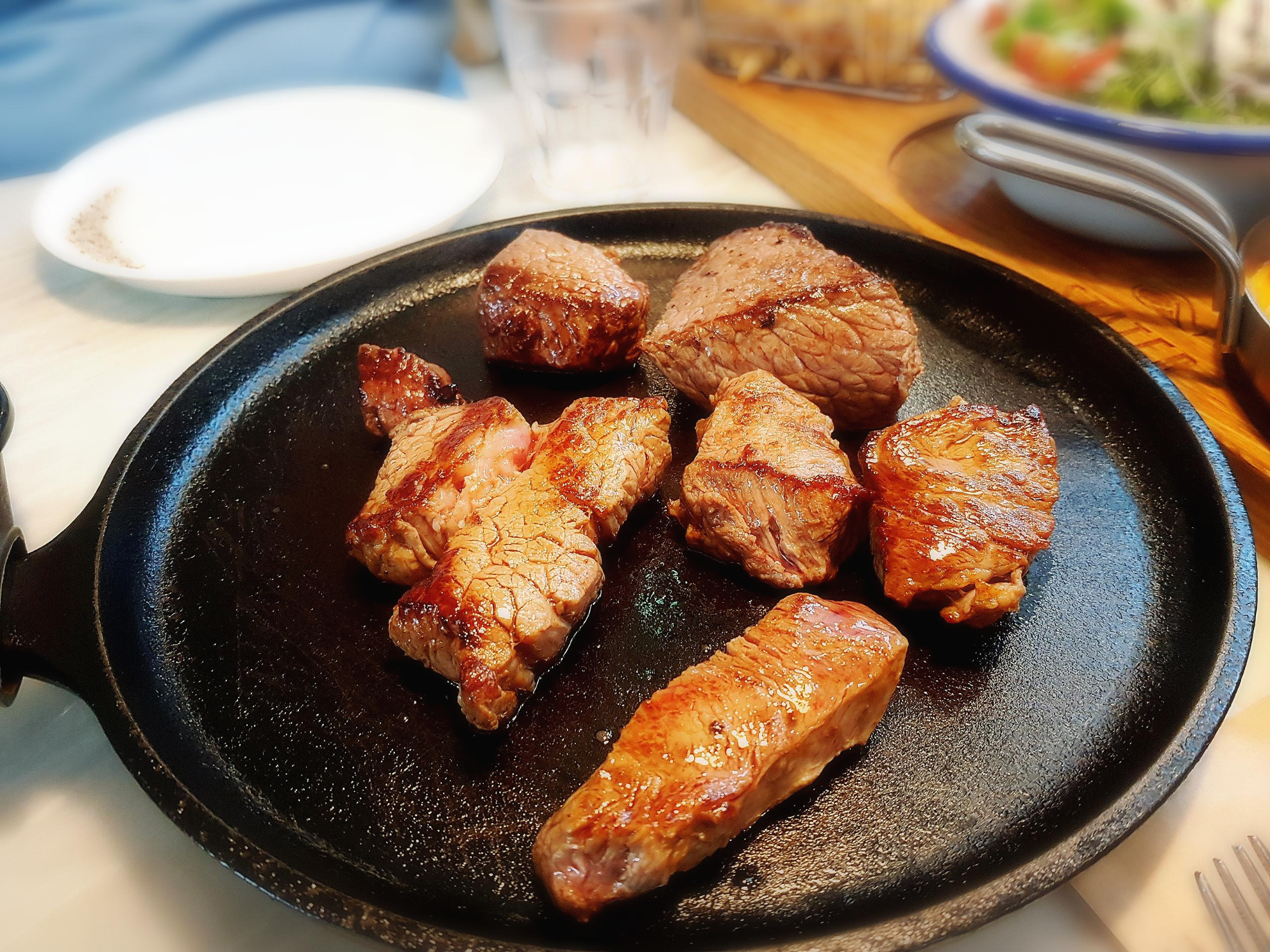 스테이크는 거의 레어 상태로 나오고, 뜨거운 무쇠 팬에 나오기 때문에 원하는 굽기로 직접 구워먹을 수 있다.