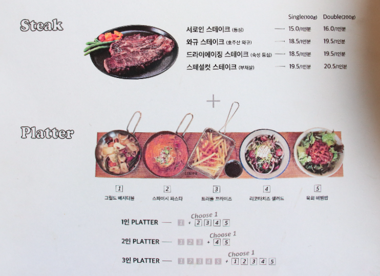 우리는 3인 플래터에 스테이크(더블)을 주문했는데,