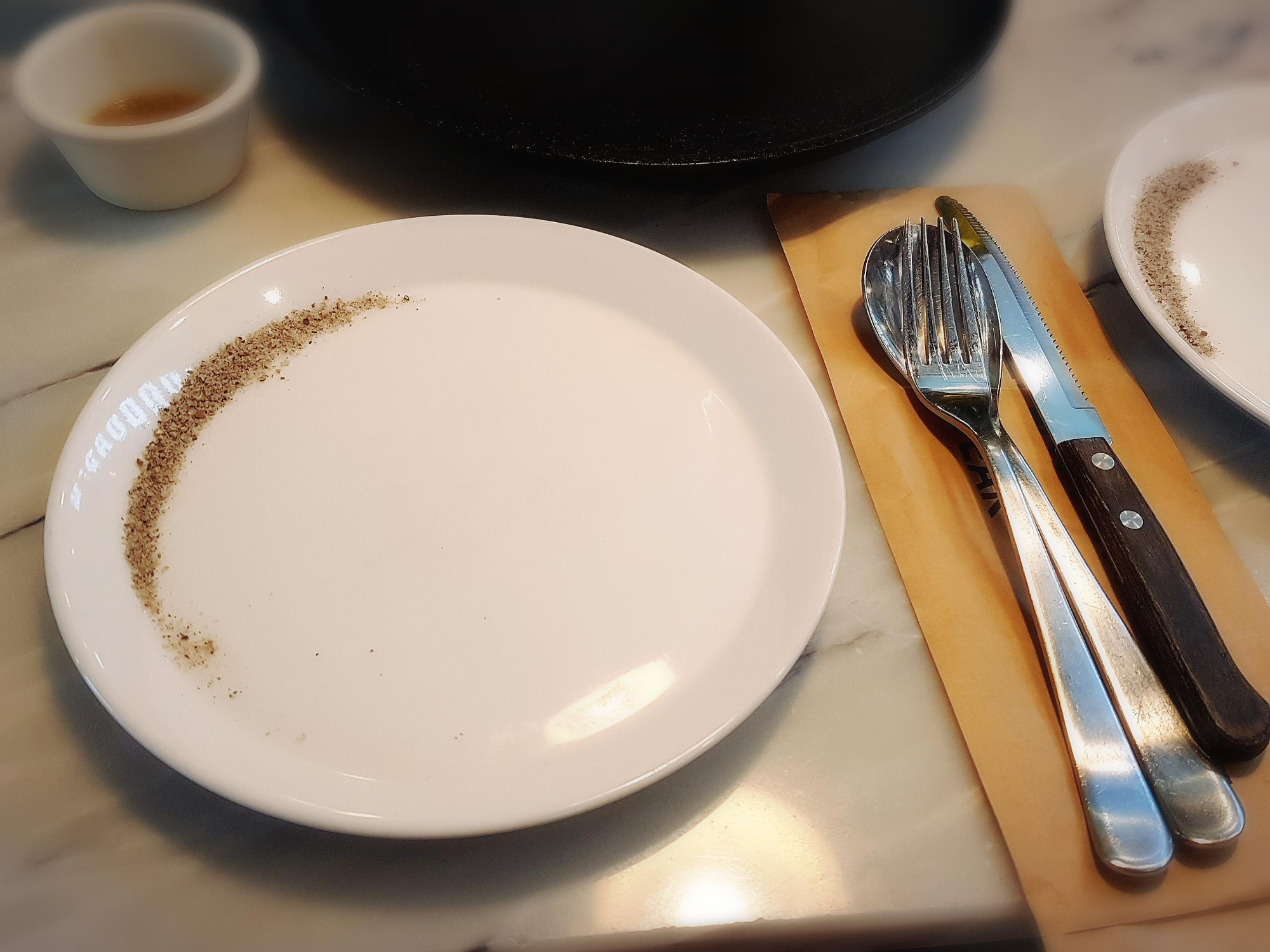 메뉴 주문하고 나니 스테이크 소금이 예쁘게 둘러진 앞접시와 커트러리가 나온다.